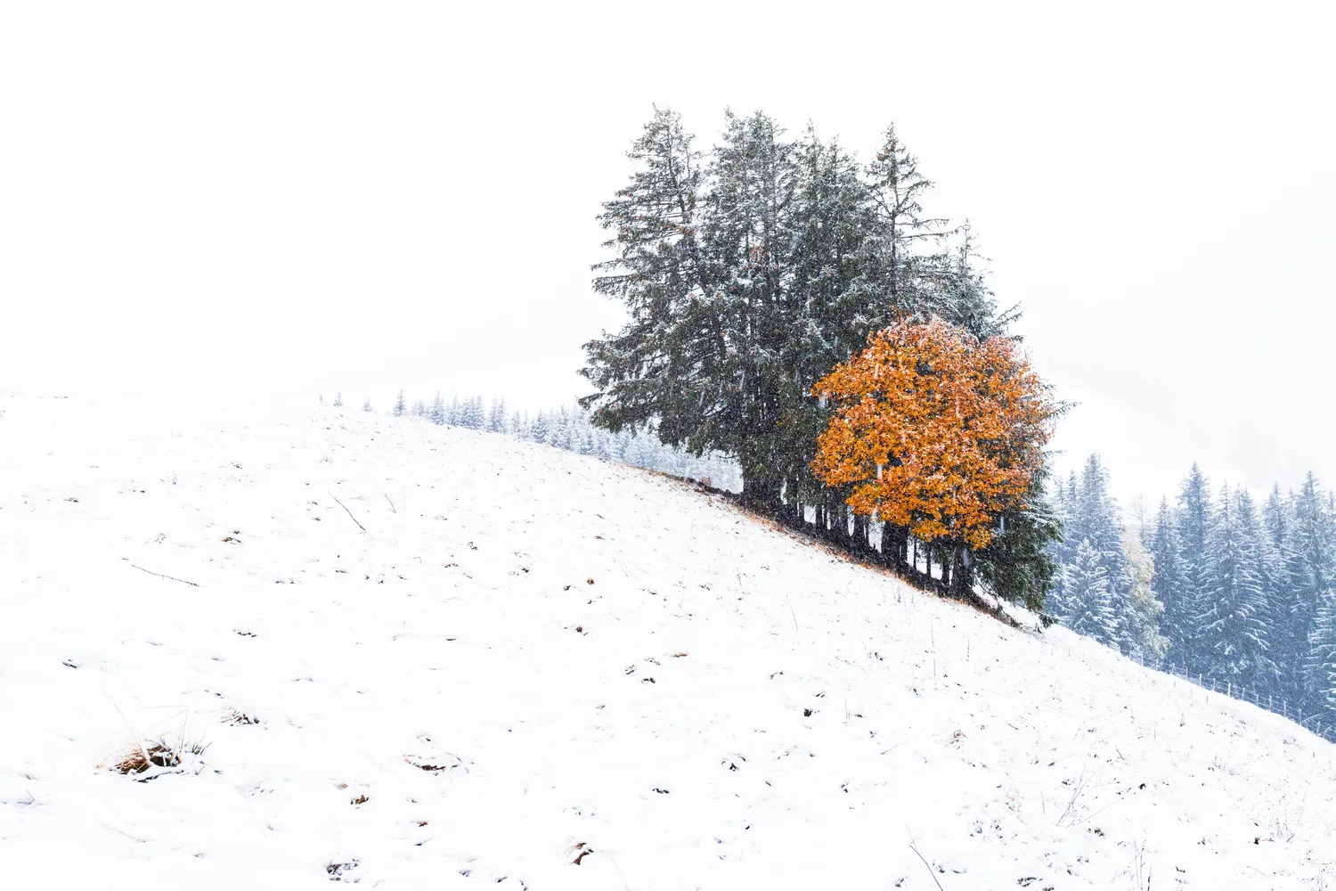 L’automne annonce aussi les premières neiges en montagne. C’est une période de transition entre les tons chauds de l’automne et les teintes froides de l’hiver. Ces oppositions créent des images fortes. Intégrez dans votre composition des éléments opposés comme : un feuillage doré vs de la neige blanche, un sommet enneigé face à un pâturage vert. Capturez également des arbres aux couleurs d’automne recouverts d’une fine couche de neige : cela crée un contraste fort dans votre image.